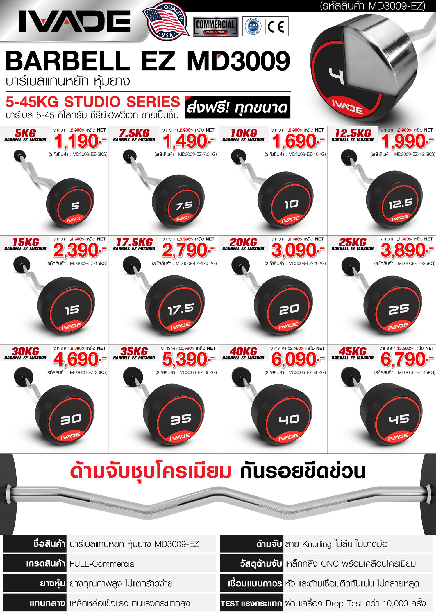 บาร์เบล แกนหยัก EZ หุ้มยาง IVADE ขนาด 5KG x 1 ชิ้น FULL-Commercial สินค้าใหม่ ยางหุ้มคุณถาพสูง ไม่แตกร้าวง่าย แกนกลาง เหล็กหล่อแข็งแรง ทนแรงกระแทกสูง ด้ามจับ ลาย Knurling ไม่ลื่น ไม่บาดมือ วัสดุด้ามจับ เหล็กกลึง CNC พร้อมเคลือบโครเมียม หัว และด้ามเชื่อมติดกันแน่น ไม่คลายหลุด