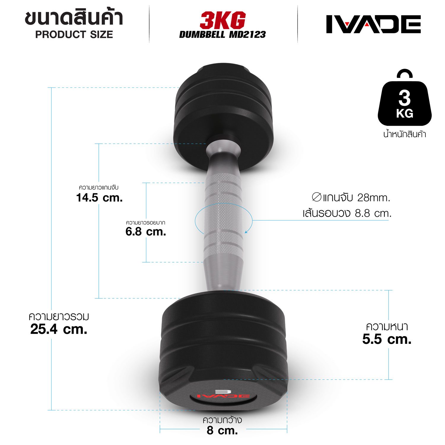 ดัมเบล STUDIO หุ้มยาง IVADE ขนาด 3KG x 2 ชิ้น สินค้าใหม่ เกรดสินค้า FULL-Commercial ยางคุณภาพสูง ไม่แตกร้าวง่าย แกนกลาง เหล็กหล่อเต็มก้อน ด้ามจับ กลึงด้วยเครื่อง CNC ความแม่นยำสูง กัดลายลาย Knurling ไม่บาดมือแต่ไม่ลื่น วัสดุด้ามจับ เคลือบโครเมียมแข็ง (Hard Chrome Finish) ทนทานต่อการกัดกร่อนและรอยขีดข่วน