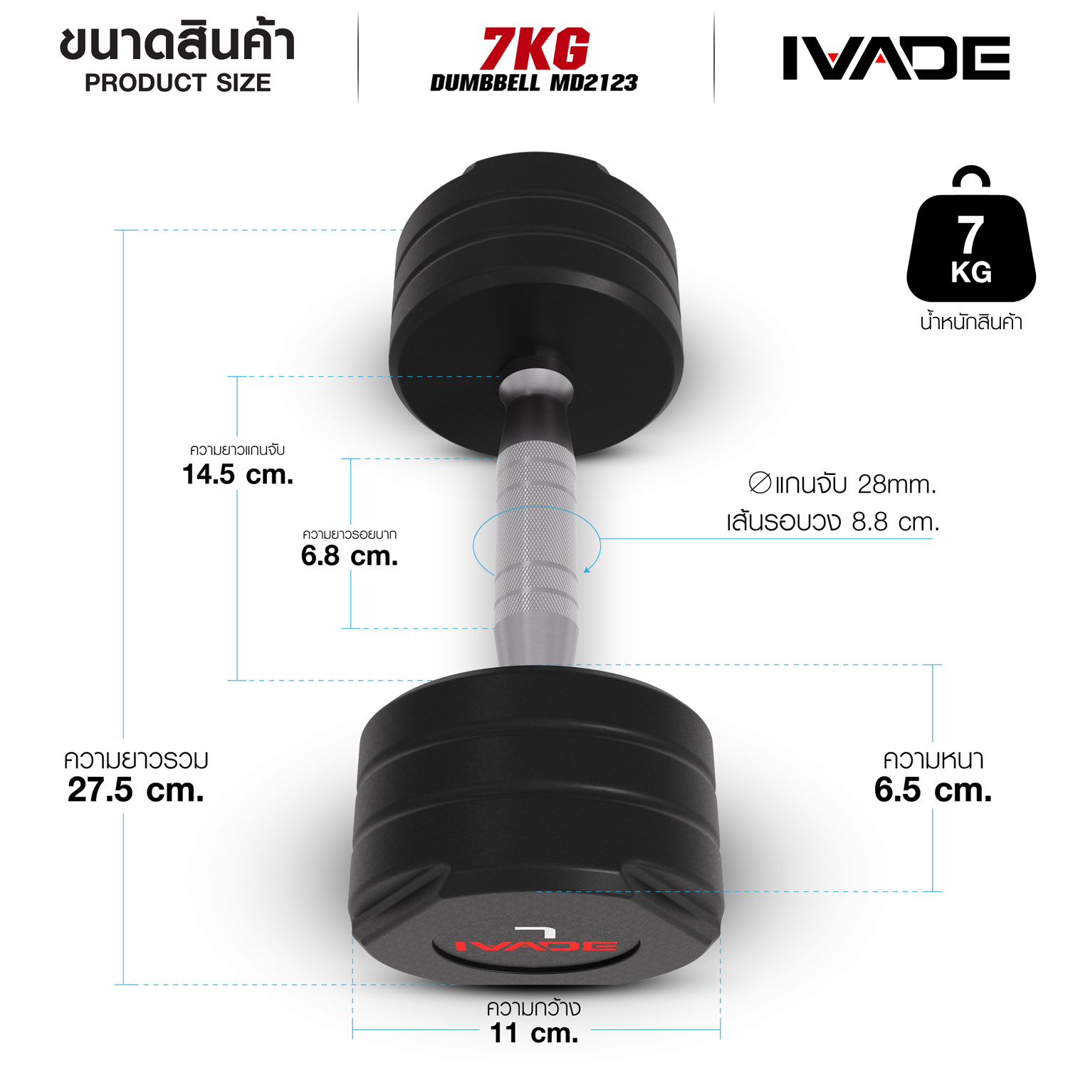 ดัมเบล STUDIO หุ้มยาง IVADE ขนาด 7KG x 2 ชิ้น สินค้าใหม่ เกรดสินค้า FULL-Commercial ยางคุณภาพสูง ไม่แตกร้าวง่าย แกนกลาง เหล็กหล่อเต็มก้อน ด้ามจับ กลึงด้วยเครื่อง CNC ความแม่นยำสูง กัดลายลาย Knurling ไม่บาดมือแต่ไม่ลื่น วัสดุด้ามจับ เคลือบโครเมียมแข็ง (Hard Chrome Finish) ทนทานต่อการกัดกร่อนและรอยขีดข่วน