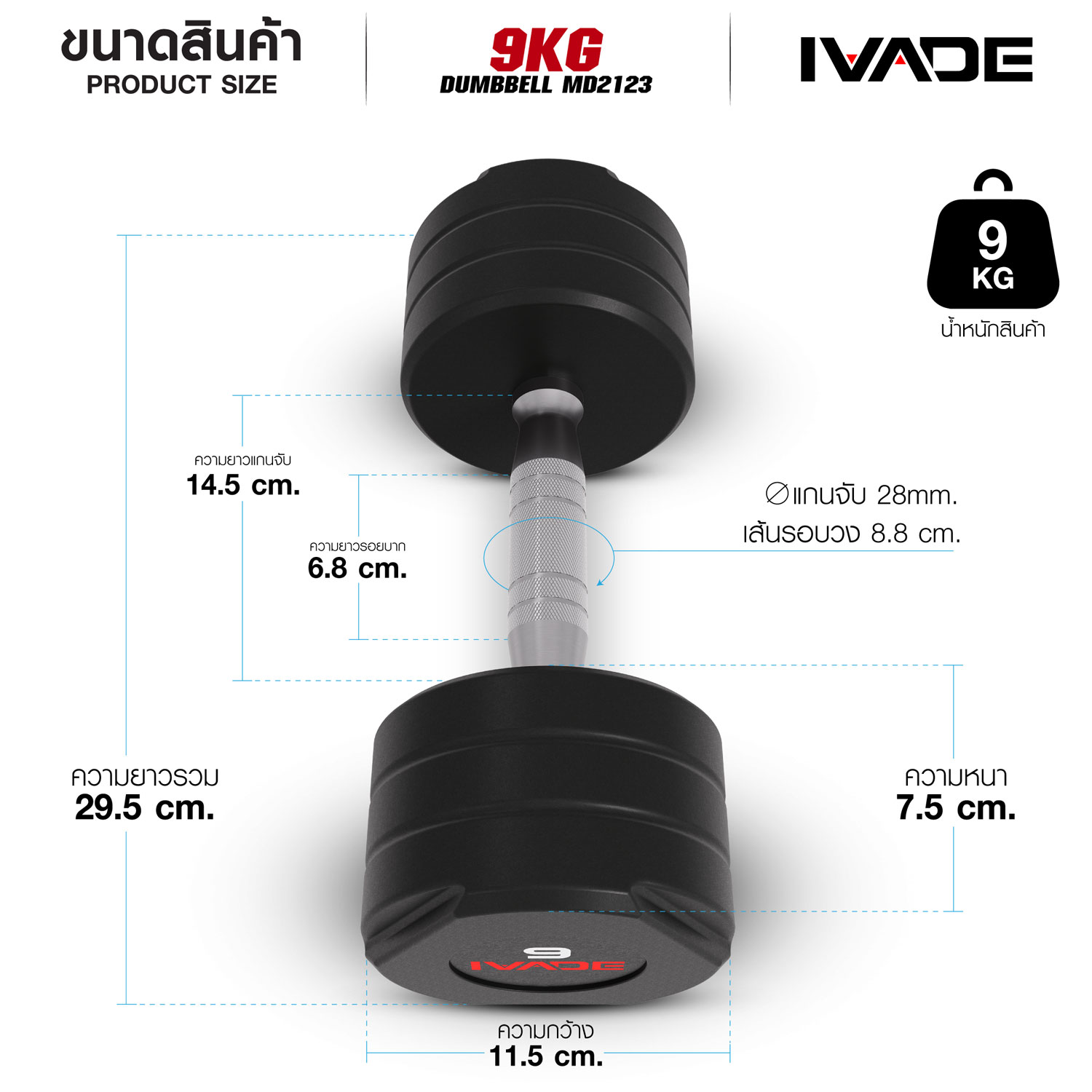 ดัมเบล STUDIO หุ้มยาง IVADE ขนาด 9KG x 2 ชิ้น สินค้าใหม่ เกรดสินค้า FULL-Commercial ยางคุณภาพสูง ไม่แตกร้าวง่าย แกนกลาง เหล็กหล่อเต็มก้อน ด้ามจับ กลึงด้วยเครื่อง CNC ความแม่นยำสูง กัดลายลาย Knurling ไม่บาดมือแต่ไม่ลื่น วัสดุด้ามจับ เคลือบโครเมียมแข็ง (Hard Chrome Finish) ทนทานต่อการกัดกร่อนและรอยขีดข่วน