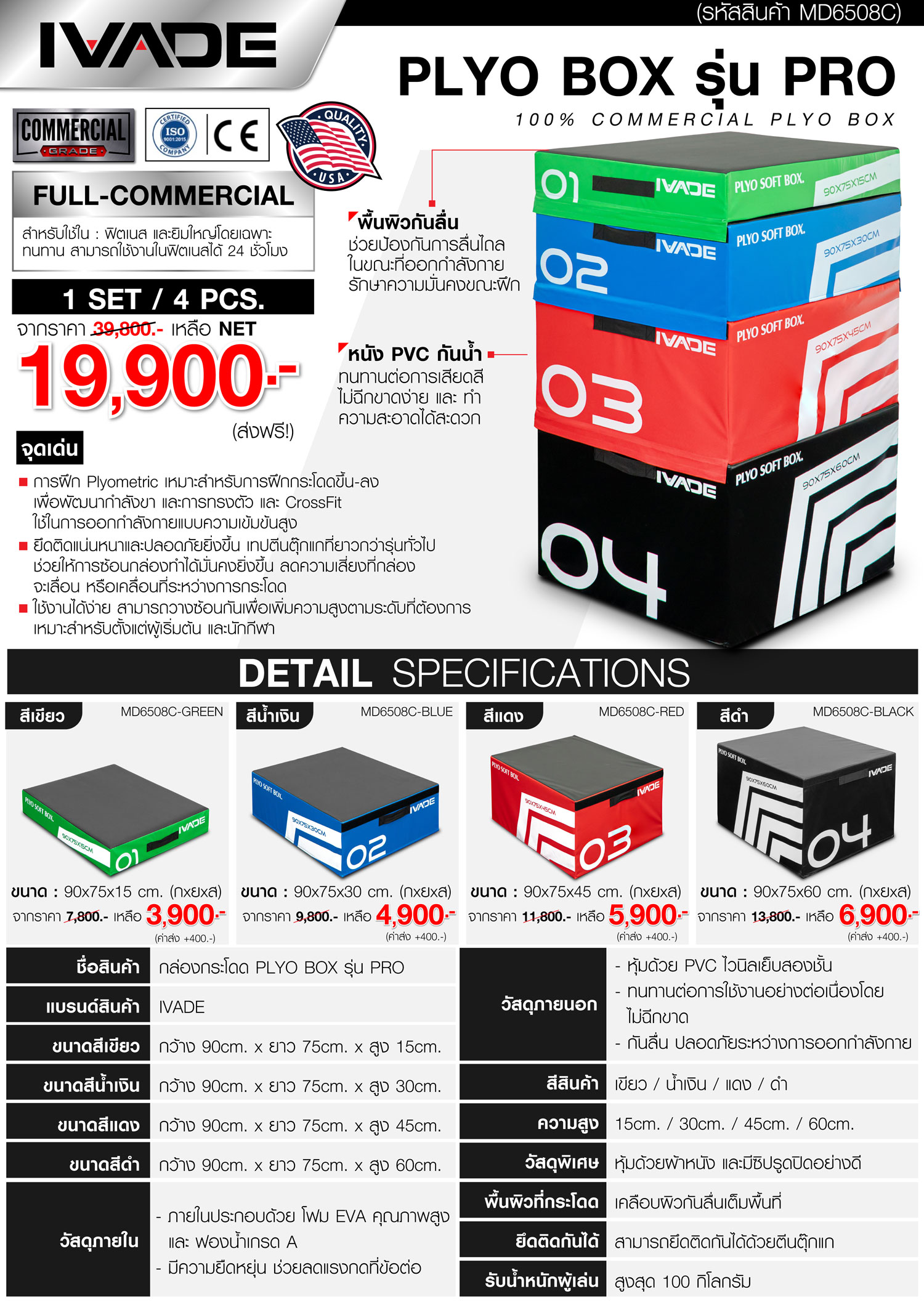 กล่องกระโดด PLYO BOX รุ่น PRO สีแดง กว้าง 90 x ยาว 75 x สูง 45ซม. วัสดุภายใน โฟม ผลิตจากโฟม EVA คุณภาพสูง ความหนาแน่นต่ำ วัสดุภายนอก หุ้มด้วย PVC ไวนิลเย็บสองชั้น ทนทานต่อการใช้งานอย่างต่อเนื่องโดยไม่ฉีกขาด และกันลื่น โฟมภายในนุ่มทนทาน (ค่าส่งสินค้าทั่วประเทศ 400 บาท ต่อชิ้น)