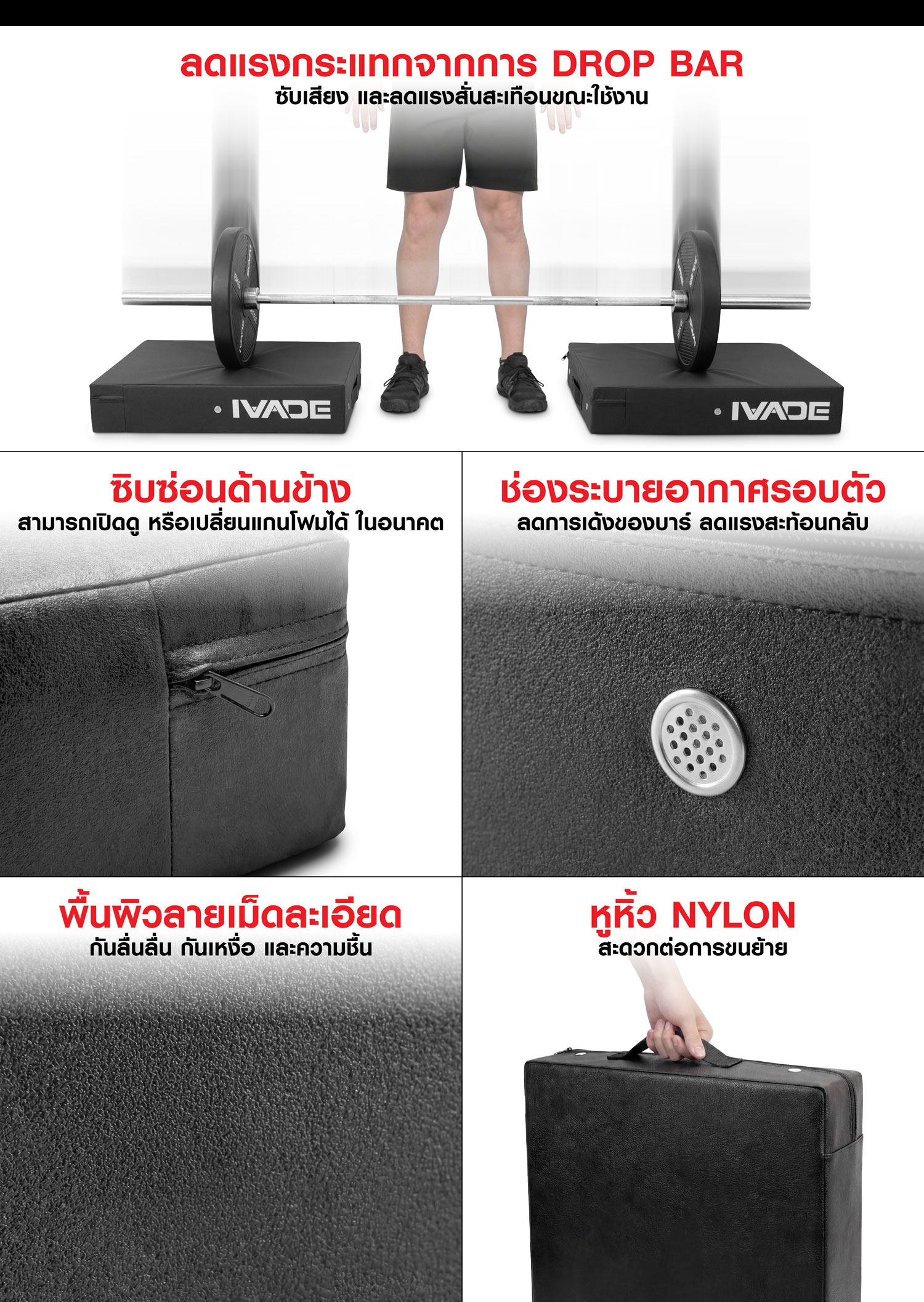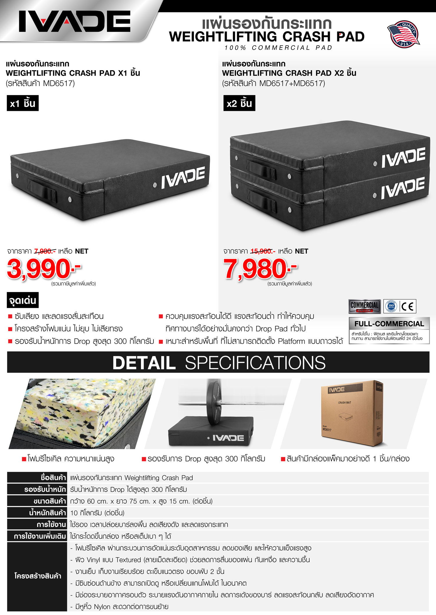 แผ่นรองกันกระแทก Weightlifting Crash Pad x 1 ชิ้น (MD6517) จุดเด่น ซับเสียง และลดแรงสั่นสะเทือน โครงสร้างโฟมแน่น ไม่ยุบ ไม่เสียทรง ควบคุมแรงสะท้อนได้ดี แรงสะท้อนต่ำ ทำให้ควบคุม ทิศทางบาร์ได้อย่างมั่นคงกว่า Drop Pad ทั่วไป รองรับน้ำหนัก รับน้ำหนักการ Drop ได้สูงสุด 300 กิโลกรัม น้ำหนักสินค้า 10 กิโลกรัม (ต่อชิ้น)
